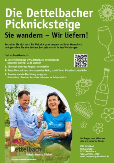 Zusammen mit einigen Dettelbacher Winzerkollegen starten wir die "Dettelbacher Picknicksteige" Und so einfach funktionierts: 1. Picknicksteige für das Wochenende vorbestellen. Telefon-Nr.: 0177-7708353 ☎️ ➡️ Vorbestellung 1 Tag vorher 2. Die Dettelbacher Traumrunde laufen ☀️? 3. Den?Standpunkt kurz per Telefon durchgeben, wohin wir das Picknick liefern dürfen. Die Standpunkte finden Sie online. ? 4. Picknick mit Wein genießen ??? Weitere Infos findet ihr hier ➡️ https://www.dettelbach-entdecken.de/post/die-dettelbacher-picknicksteige