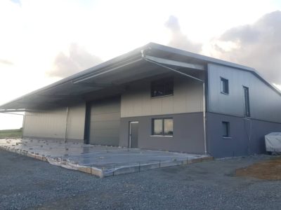 Inzwischen ist das Dach gedeckt, die Wände verputzt und gestrichen, Lichter angeschlossen sowie die Leitungen verlegt. Bevor die Halle dann eingeräumt werden kann, wird Anfang November noch die Bodenbeschichtung aufgetragen.