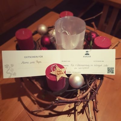 Nur noch eine Woche bis Weihnachten und Sie wissen noch nicht, was Sie schenken sollen? Wie wäre es mit einem Gutschein für ein Weinpaket oder ist eine Übernachtung in unserem Weingut das perfekte Geschenk für Ihre Lieben? Dann schreiben Sie uns einfach eine E-Mail an info@weingut-knauer.de oder kontaktieren Sie uns telefonisch. Wir erstellen Ihren persönlichen Gutschein und versenden ihn portofrei.